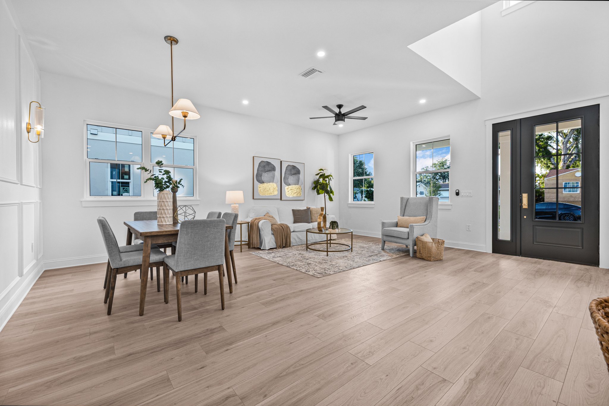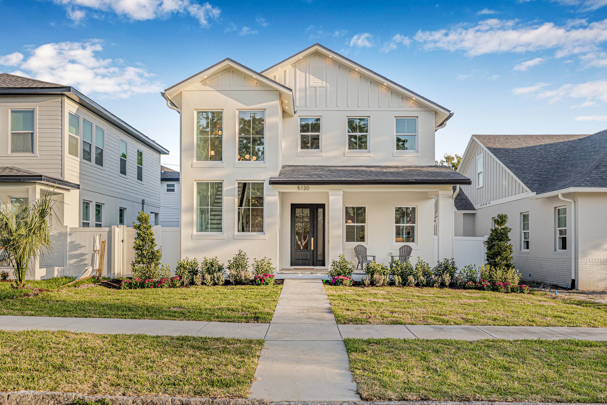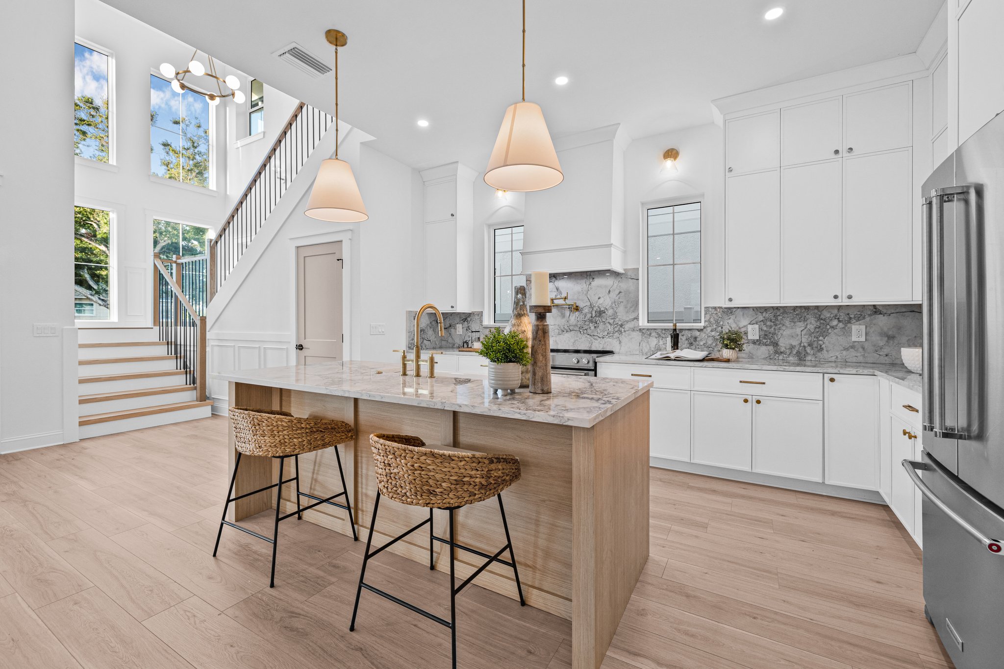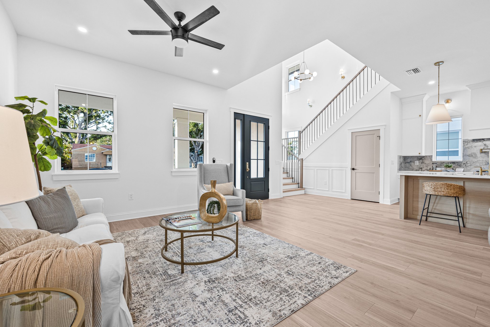 A polished new-construction residence in North St. Petersburg with a first-floor primary suite, dramatic open living volume, and designer-led finishes throughout. The home balances crisp architectural lines with warm, livable interiors and a layout designed for both everyday comfort and effortless entertaining.
