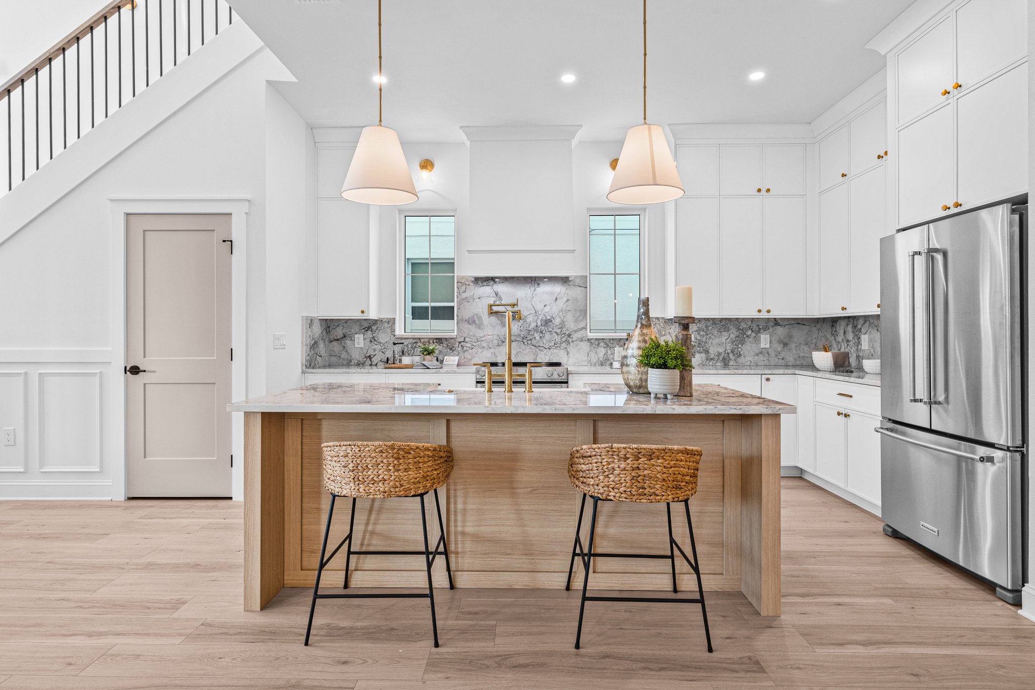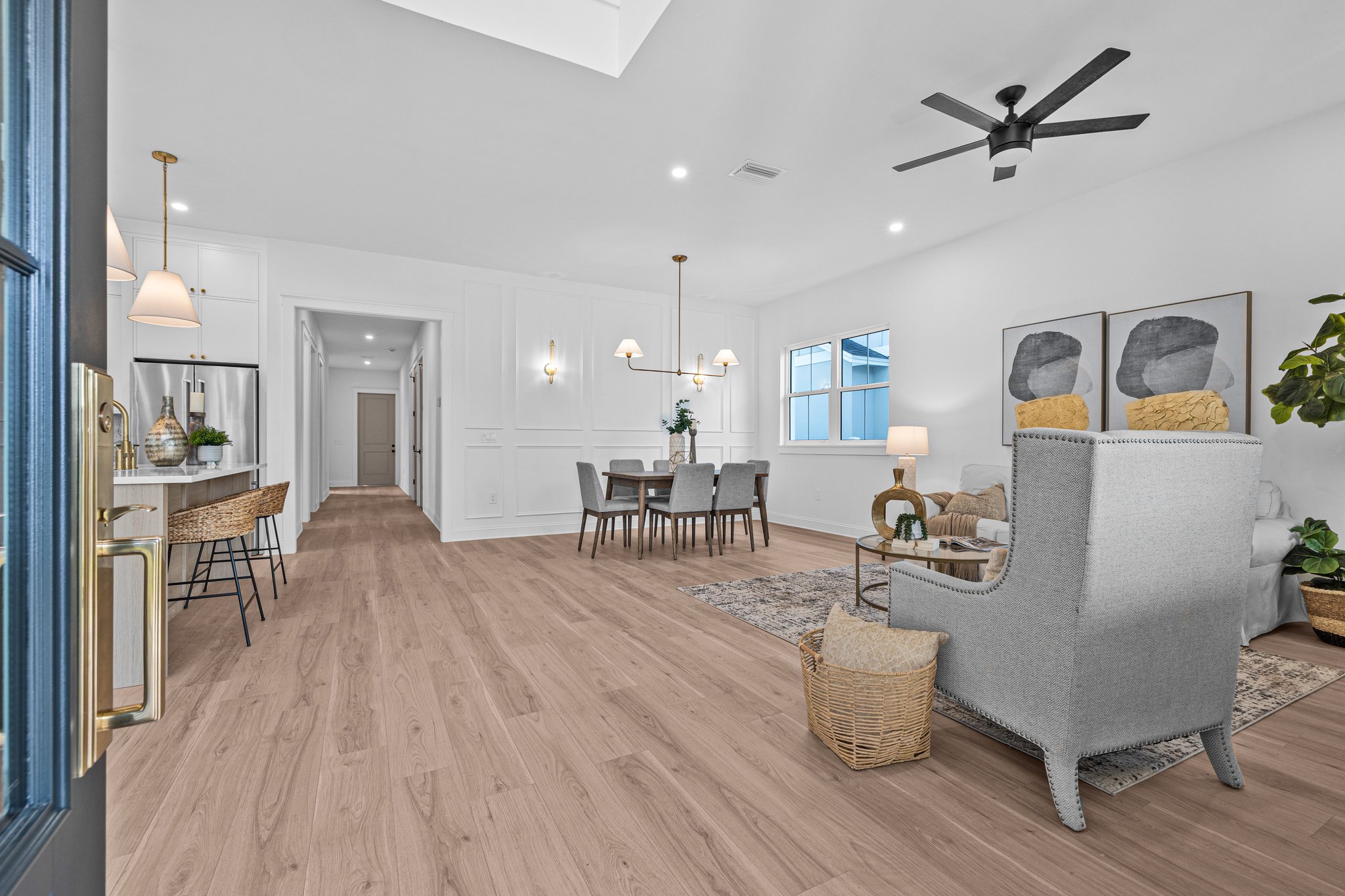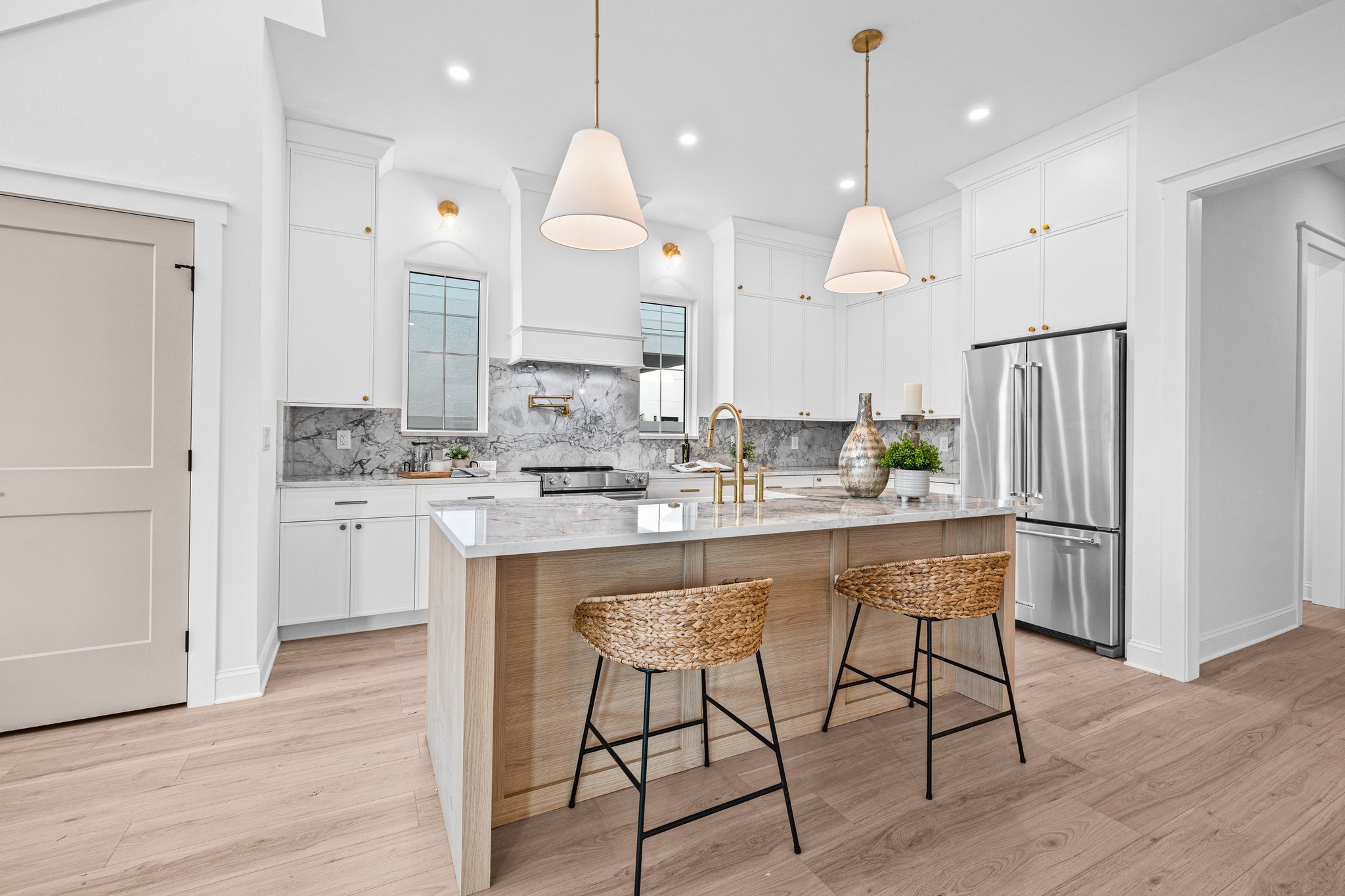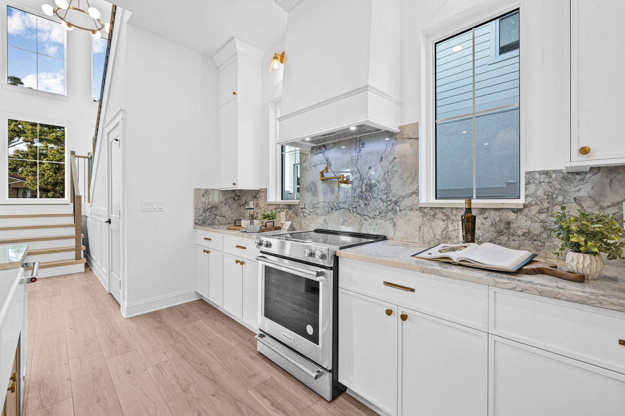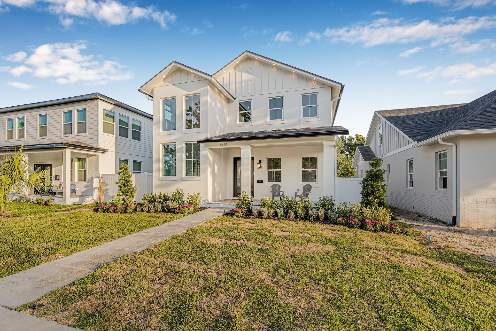 A polished new-construction residence in North St. Petersburg with a first-floor primary suite, dramatic open living volume, and designer-led finishes throughout. The home balances crisp architectural lines with warm, livable interiors and a layout designed for both everyday comfort and effortless entertaining.